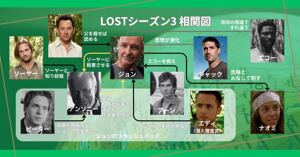 シーズン3は「人」と「組織」の謎を回収し、「島」と「運命」の謎を意図的に残したシーズンである。