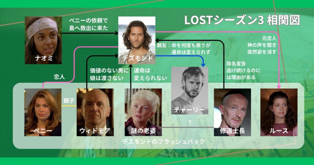 ハッチ爆縮以降、未来を見る能力を得たデズモンドは、シーズン3を通して「運命は変えられるのか」という問いを体現する。