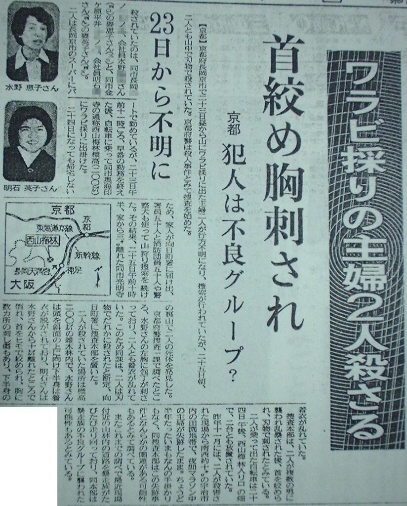 被害者は、長岡京市に住む主婦のAさん(43)とMさん(32)。二人は地元のスーパー「いずみや」に勤めるパート仲間。Aさんはワラビ採りに慣れていたが、Mさんは全くの初心者で、同日午後3:30頃には保育園に子どもを迎えに行く予定だった。