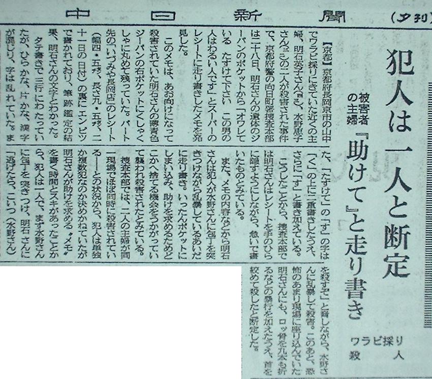事件は最初「複数犯」の犯行だと報道されていましたが、被害者の残したメモから警察は「単独犯」と断定。犯人はMさんに包丁を突き付けながら「逃げたらMさんを殺す」とAさんを脅し、犯人がMさんを暴行してる隙にAさんがメモを走り書きしたと推測されました。